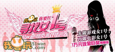 9月,丰收的季节、欢度的季节,一个值得收藏的季节,金色的九月,《武林传奇2》将迎来万元现金征集全国代言人评选“寻找女一号”大型活动,“我要玩 你要红”,2009年首届“寻找女1号”暨51wan(我要玩)网页游戏代言人海选活动将于9月28日正式拉开帷幕。用美丽传递快乐,让网络延续激情,登录“寻找女1号”官网,上传你的个人形象照,邀请亲友来为你投票,你就有机会成为51wan(我要玩)网页游戏的女一号,以及电影及平面大片的女一号。还等什么?即刻加入游戏圈与演艺圈首次大型造星运动吧!详情关注官方网站!