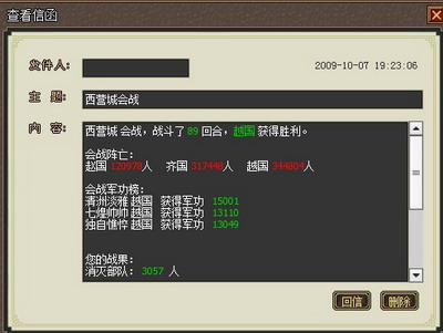 “赵”因为屠杀我们没有粮食的部队,加上长途战争,也是弹尽粮绝。正可谓是“出来混,总是要还的”。这时,在西营城出现了“赵”的第一BOSS,爆了1800禁卫军,用岳飞带队(那1800的禁卫,反击一出,无论什么兵都能秒掉,所以我们叫做BOSS)。一时无两,光芒四射。我们至少折损了10000兵在他手上,但最后,还是把BOSS打掉了,“赵”在无法增援的情况下,只得结束了这场战争。这就是越赵大战的开幕。也可以说是2服现在最强大的一场战斗——3国大战,这场战争也结束“齐”的气数。