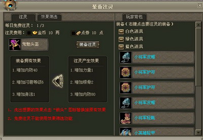 “注灵”的推出对许多刻苦钻研装备的玩家们无疑是绝世良机,更令人欣喜的是,只要符合条件,玩家每天都可以免费“注灵”!具体规则是,1转以上的玩家每天可免费注灵1次,2转玩家每天2次, 3转玩家每天3次,满级玩家每天5次,1转以下玩家暂时不能免费注灵。每天免费注灵次数使用完后,可以使用金锭或点券注灵,使用点券注灵后被注灵的装备自动绑定。