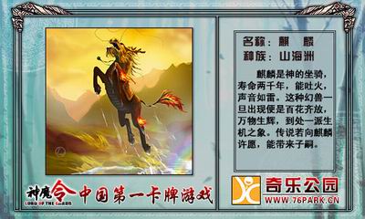麒麟是神的坐骑,寿命两千年,能吐火,声音如雷。这种幻兽一旦出现便是百花齐放,万物生辉,到处一派生机之象。传说若向麒麟许愿,能带来子嗣。