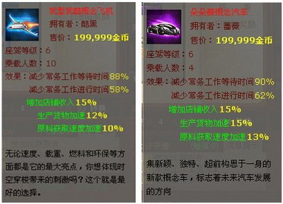 合成后的概念座驾除了可以极大的减少常务工作等待时间、进行时间,提升常务工作的效率外,还同时拥有3个额外的特殊属性,即增加店铺收入、加速生产货物速度、加速原料获取速度等,最高可节省等待时间的90%。