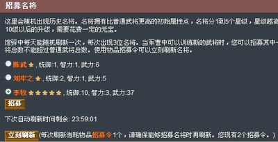 难得的一个周末,转眼飘过了,今天早上一开我的城市,那显眼的报告:我的城市遭袭了。分别被三个该死的陆续攻击,我那毫无防范的…,可怜的一百多文明度,还好还有系统赠送的几百块元宝,即刻进商城一狠心买下10个招募令,咱拿来去馆驿,拼命的刷,我刷,看着招募令一个一个的消失,怎么还不滚出个好点的,一定要刷个五星名将,反正是送来的元宝,非要刷出个五星的不可,突然眼前一亮,五颗亮星星呈现在眼前,好运总算到来了,是李牧的,但却不能招募,原因:我唯一的一名新武将被灭,赶紧将他复活,咱终于也有个名将了,还不错,李牧,武力37,智力3,总算不是个白痴,还有点智商,我要开始魔鬼式训练,那几个混蛋就等着看老子怎么收拾你们吧!