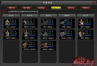 《决战天下》之所以为玩家们所热衷,正因为它的兵种相克系统独具创新。在很多战争策略类网页游戏中,你会发现总有那么一两个兵种非常强大,只要拥有了它们,在战斗中就绝不会吃亏。而《决战天下》却打破了这个谬论,它将现实中的战争规则引入游戏,兵种之间相互克制。只有掌握了这些相克规则,动用自己的聪明才智排兵布阵,才能以最小的损失获得最大的胜利。
