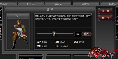 在《决战天下》中,特工探子都是在暗堂中被培训出来的。招募这个兵种后,这个兵种的特殊之处并不需要分配给武将统帅,他们将是由你亲自指挥的一个特种部队。只要你一声令下,特工们就会尽职尽责的为你打探有关各项资源的数量、敌人武将数量、等级、品级、所带兵种等等的一切信息。