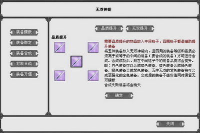 6)除五件无双紫装外,合成失败,五件装备均消失;五件无双紫装若合成失败保留中间装备,四周消失。