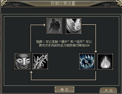 在游戏中计策是出兵进攻和组织防守时可以选择的策略,计策的正确使用可以有效的削减对手的攻击力或防御力,利用正确的计策可以起到克制对手的作用,从而达到以少胜多的目的。在进攻中计策可以在每次部队的派出前可以进行选择关于进攻的计策,而在防守中计策可以在一些的防御建筑中改变。 所谓“计策相克”就是比如:你在选择“虚兵”和“乱水”进行攻击或者防御的同时,可以使对手的“陷阱”和“火攻”无效果;又如你在选择“虚兵”和“乱水”进行攻击或者防御的同时,对手使用的是“埋伏”和“连环”那么你的“虚兵”和“乱水”无效果。