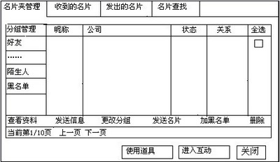 名片列表显示有:昵称/等级,公司/等级,所属商会/等级,状态(在线/离线),关系(友好/陌生/敌对),可执行操作。在显示界面增加显示全部好友选项:点击名片夹管理,默认进入好友全部显示界面。