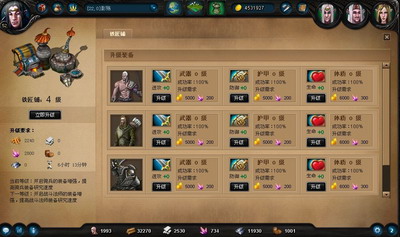 铁匠铺是一个研究兵种装备的系统,这里可以制造各种先进装备,大幅度提高军队的杀伤力与防御力。研究有一定的成功概率。