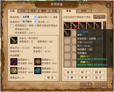 玩家可以在下拉框选择是否加入“精炼石”,“精炼石”可以增加玩家打造出高品质装备的概率。最后玩家点击“锻造”按钮,系统将自动搜索符合要求的材料,选择确定开始打造!