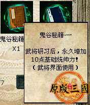 作为鬼谷先生的秘籍著作——鬼谷秘籍,只要武将研习后,永久增加基础属性统帅力!不同等级的秘籍提升不同点数。