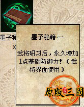 在战国的乱世,墨家的弟子们对防守性的军事行动最有研究。武将研习后,也将会永久增加基础属性防御力!不同等级的秘籍提升不同点数。