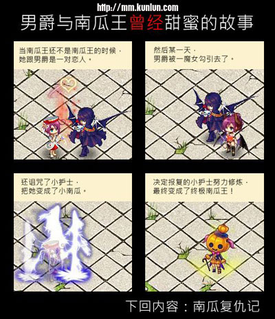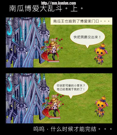 《美眉梦工场》10月精彩大型GM互动活动——南瓜王征战MM众学院,虽已是两个月前的辉煌往事,但是南瓜王、邪恶男爵等曾由MM的GM真人扮演过的角色,却依然风头强劲,深入人心!而随着MM二阶战斗任务的上限,鬼族BOSS之一的博爱这个大反派,也凭借独特的个性,与众不同的造型,同样成为广大玩家津津乐道的话题人物。这不,在新年即将到来之际,资深玩家写手佳*便以这三位MM世界的风云人物为主角,倾情打造出了一出超有喜感的“男南恋”四格剧,并且剧情超级“狗血”哦!下面,就赶快看一看南瓜王、男爵与博爱之间究竟是怎样纠结在一起的吧!