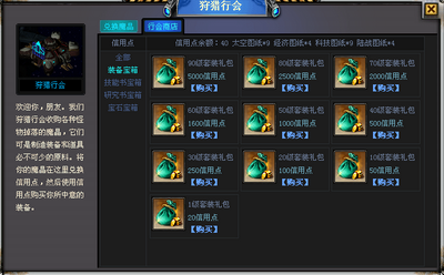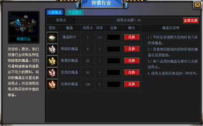 玩家在狩猎公会内可以通过上缴打怪或英雄修炼获得的魔晶石来兑换信用点数,信用点数可以在狩猎公会的公会商店内购买极品套装!