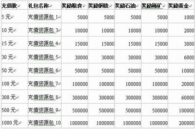 活动内容:活动期间,玩家进行充值,则充值后将获得相应的资源包的奖励,奖励比例为1:1000,例如玩家充值5元,即可获得资源包一个,内含各种资源5000,黄金1000。充值10元则奖励各种资源10000,黄金2000的资源包。