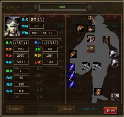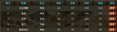 玩家可在将领排行中直接选择将领点击“查看“按钮查看该将领的详细装备情况