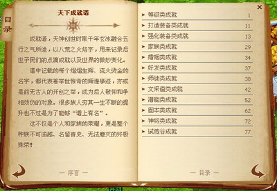 《冰封天下》里的成就系统包含100个以上的个人成就,这些成就覆盖了游戏的所有内容,包括杀怪、文采、结婚、打造、角色发展等。从稀奇古怪的娱乐到史诗般的战斗,每个人都能找到适合自己的内容。某些成就同时为你提供游戏内的奖励,例如普通称号和带少许属性的特殊称号。所有奖励主要只是起装饰作用或是娱乐作用。不过当你在他人面前自豪地展示这些成就时,肯定是非常神气的,你也一定会非常的引人注目。