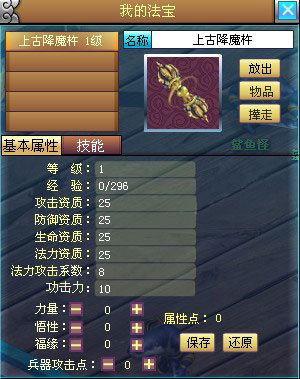 上古降魔杵需要使用上古降魔杵法宝炼化炉炼制,上古降魔杵法宝的成长系数为6.0。注:昆仑神器的等级达到10级才能炼化上古降魔杵。不论是否成功,每次炼化需要消耗经验x150万、银两x3万、法宝炉神炭x300。