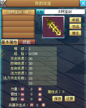 太阿宝剑需要使用太阿宝剑法宝炼化炉炼制,太阿宝剑法宝的成长系数为9.0。注:上古降魔杵的等级达到10级才能炼化太阿宝剑。不论是否成功,每次炼化需要消耗经验x100万、银两x3万、法宝炉神炭x500。
