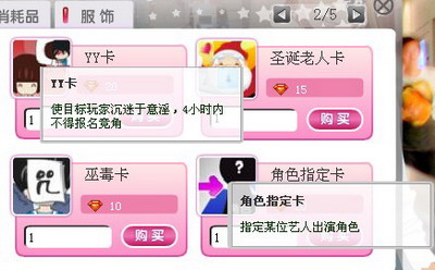 可是《星客志愿》里的道具种类是在太多了,究竟如何选择才能达到对自己有利的目的呢。关于这个问题那真是仁者见仁啊,正所谓好钢用在刀刃上,在恰当的时间使用恰当的道具,绝对可以收到意想不到的结果。例如,你和某个玩家都在竞争演员类的排名,在他正准备大干一场的情况下给他用一张YY卡,使他在四个小时内不能报名竞角,而你则可以狂接戏、狂攒积分,这难道不是一件十分美好的事情吗?