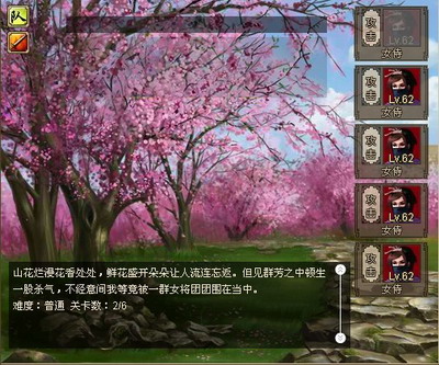战胜5名侍卫之后便来到北斗山山腰,只见山花烂漫,让人流连忘返。但群芳之中顿生一股杀气,不经意间我们竟被一群女将团团包围。