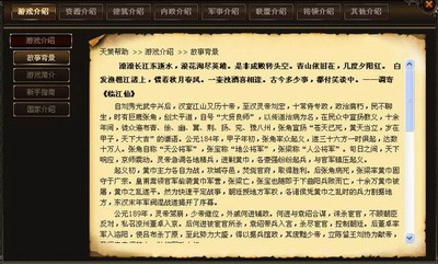 如果对游戏还不太了解,如果想知道更多有关三国的知识,如果想在游戏中快速发展壮大,马上进入《三国演义之天策》的帮助系统了解下吧,也许这里有你百思不得其解的神秘答案,也许这里还是你拜师入门的黄金宝地。更人性化的特色帮助系统,更加合理化的游戏设置。同玩三国题材类的游戏,同在SLG的网络游戏战场上,《三国演义之天策》给你更加创新舒适的游戏体验。
