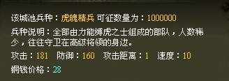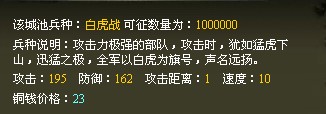 白虎战,是一支以白虎为旗号的部队。攻击力极强,攻击时,犹如猛虎下山,迅猛之极,声明远扬。每招募一个该兵种,需战绩:4 。