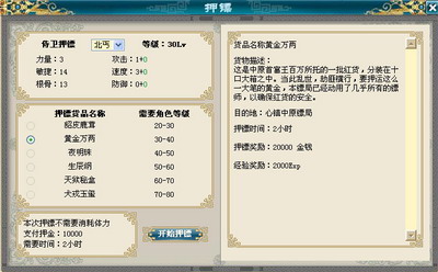 在游戏中,玩家可以通过在镖局交纳一定押金后,接受押送某一趟镖货。这趟镖明码标价,如果能押镖成功,玩家可以获得这些奖励,如果被别人劫走,那么就会损失自己的押金,也得不到奖励。同样,玩家也可以去找NPC进行劫镖,需要缴纳一定的押金。在追上押镖之人后,如果你能够打败他,劫镖就成功了,那么你就能获得丰富的奖励。