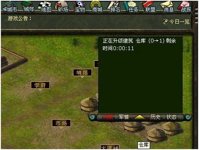 为了以后的城战,首先要做的就是积累资源了,资源放哪里呢,可以直接点击空地上面的仓库,接着便会弹出一个对话框,只要点击建造即可。相应的,军营,学府,校场等也是如此操作。
