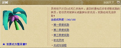 随着迷雾森林的树木被各种老鼠的破坏日趋严重,使得整个刃雪城的绿色环境受到大大的创伤,刃雪城城主空明寻访世界各地,终于寻得大量的灵树种子,可是这种树木不易种植,并且在种植过程中会出现大量的病变,如果不及时处理,将会导致该种树木的死亡!于是城主空明向各大家族发出通告,如果能帮助种植该种植物的家族,所有成员都可获得大量奖励,于是一股种树热潮就在各个家族中展开了!