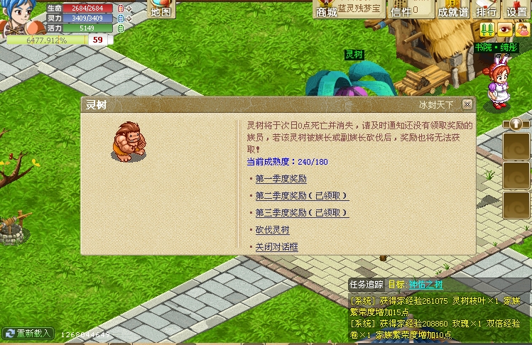 第四步:即灵树成熟后家族中的所有成员即可收取灵树奖励,如经验、繁荣度、家族贡献、灵树枝叶、火焰结晶等。