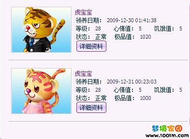 虎宝宝满25等级的时候,就可以去兑换新的虎宠,每个不同极品等值的虎宝宝兑换出的虎宠都是不一样的哦:0-499点极品值的虎宝宝只能兑换老虎模型家具;500-999点极品值的虎宝宝可以兑换跟着身边的虎宠精灵;1000及1000点以上极品值的虎宝宝就可以兑换会飞带有翅膀的虎宠了哦!