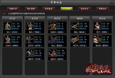 《决战天下》打破了一个兵种天下无敌的荒谬理论,巧妙的设计了模拟现实战争的兵种相克系统。参加据点战,各种兵团必不可少。在各盟主和联盟成员的参与下,一支支强大的剑兵团、长枪兵团、弓兵团、精锐重骑兵团、器械团等12个种类的兵团被组建起来。利用兵种的相克关系,进行兵种的配比,安排武将主擅兵种,这些都需要玩家联盟内部进行统筹。盟里所有玩家的武将,兵种聚集到一起,参与战斗。相信每个玩家在这样的气氛下都会既紧张又兴奋。