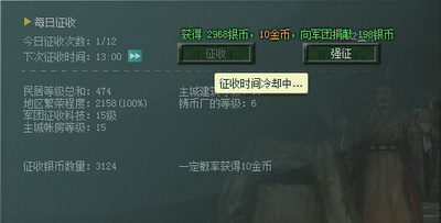 “想要金币怎么办?拿人民币冲啊!”以往的游戏中,RMB是获得金币的唯一方法。傲视天地中,充分的考虑到了非RMB玩家的利益。玩家在每次征收中,都有几率获得金币。游戏中还提供了铸币厂,通过对这个建筑进行升级可以提升获得金币的概率。让每个玩家都体验到RMB玩家的乐趣。