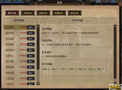 游戏任务多元化,分新手,日常,成就,联盟,武将任务等等。
