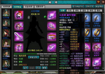 破军套装是一套适合攻击将领的装备,套装防御能力不是很强,攻击力很突出,值得关注的是破军套的暴击率和暴击伤害。合理的镶嵌6级宝石后的破军套装体力可以增至2200多点,其中500点的将的体力和500兵的生命这个套装属性发挥了重要的作用。破军套装适合站最后一个位置的将领穿戴,这样能最大限度的发挥这套服装极高的暴击伤害。