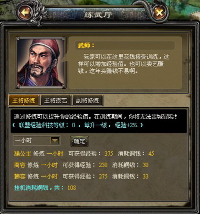 这世道很不安分,“攻其不备,趁火打劫”的敌人多如牛毛。这时,你若想在二十四小时内每分每秒都可赚取经验,那绝对不能错过享受“挂机修炼,狂赚双倍经验”的乐趣。独特设置的“练武厅”之“主将修炼”、“主将授艺”和“副将修炼”的功能,即是在无需操作的情况下,让你不在电脑面前的时间变得更有价值。让你的将士“宅”在城中,然后轻松选择时间,点击修炼,即可让他“宅”出味道,“宅”出经验。