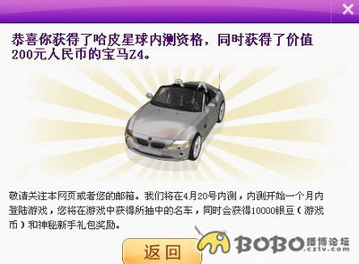 哈皮星球“秒杀极品宝马”活动于2010年4月8日起 每天分13:30-14:30,20:00-21:00 两个时段进行,每次放出2500个哈皮星球内测资格供玩家抢驻,同时系统随机送出从奥拓两厢到极品宝马不等的名车作为奖励。结果一个小时的活动内容, 往往5分钟内便被一抢而空。