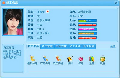 游戏的员工名字千奇百怪,但是还有规律可言,象有的比较少的姓氏,爆冷门的概率很大,比如姓房。名字也很有研究,好名字不一定顺口,这里重点介绍推荐下曼,最好这个字在中间,在最后的要差点。朋友们游戏还有好多好姓,好名字等着你们挖掘。