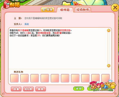 而当亲密度达到一定高度的时候,《食神小当家》邮件系统就会自动发送“亲密度奖励”邮件,通知你可以和你的知己组队去NPC“哈里?蕾”领取丰厚的,独属你们俩的,异常幸福甜蜜的亲密度奖励。