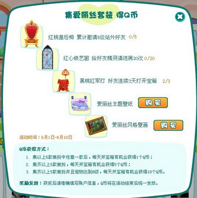 集齐以上五款爱丽丝装扮,每天开宝箱都有机会获得5个Q币;