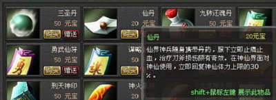 再介绍的就是能改变战斗结果的宝物:柴胡草:20元宝,三圣丹:80元宝,仙丹:20元宝,九转还魂丹:80元宝。作用是恢复仙人的法力和体力,在战场上有着起死回生的作用,是后期南征北战的必需品,所以个人建议提早库存,战火之年,可是抢手货,排队未必买的到。