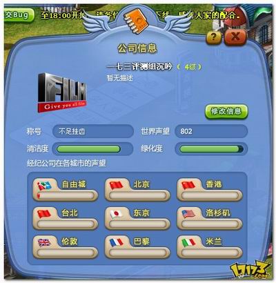 对公司来说最重要的是声望,城市声望限制购买装备、发行作品、举办活动等等。各城市的声望总和就是世界声望,世界声望限制公司等级、出道艺人数、收藏艺人数、工作人员数等等,对作品发行收入也有一定影响。除了自由城的声望可以通过通告获得之外,其他城市的声望需要玩家通过举办活动获得。
