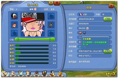 艺人具有不同的特性和天赋。特性主要影响艺人的生活状态,如喝酒、用餐的效果和压力、体力、无聊的效果。天赋如创作天才、制作能手能使艺人的属性额外增加。