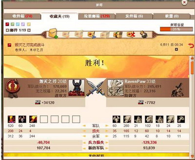 如:排名600开外的玩家“末曰之刃”对全服排名前20玩家“RavenPaw”的反围剿战,并获得17w对敌24w,20级对33级英雄,最终以4w兵力歼敌13w的辉煌战报: