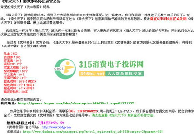 今年6月4日,一纸公告,宣告酷狗《烽火天下》停服,引起了很多玩家的不满,但更多的还是无能为力的无奈.关于停运,酷狗方面并没有按照国家规定提前2个月通知,也没有做出任何解释,所以玩家强烈要求酷狗游戏作出合理解释并道歉,还要求他们做出适当赔偿.玩家周先生说,即使可以去《武林帝国》注册账号,给了点"奖励",但作为玩家,心里依然很难受,而且让他很生气的是,《武林帝国》的注册窗口竟然打不开.