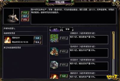内城建好学院后,可以升级生产和军事科技,从而提高资源生产能力和军队的战斗力。随着兵营和科技的升级,兵营中可以制造更高级兵种。另外打造技术也需要科技支持。