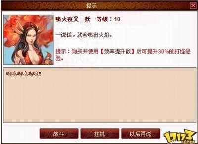 在野外场景可以选择和怪物战斗或挂机。战斗会扣除精力值,当精力点变为0后,获得经验值和道具几率将大幅下降。