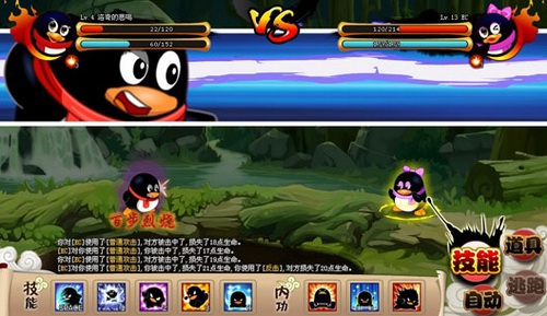战斗方面与Q宠大乐斗有所不同:自由选择技能、有内功、可以用道具增加血量,战斗时可自行选择实施的技能(内功除外)。这些都是亮点。