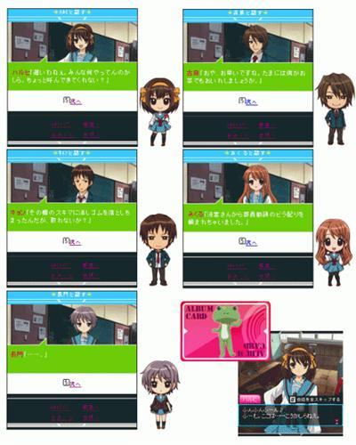 游戏内还包含很多《凉宫春日的忧郁》粉丝必看的秘密插图,随着游戏的进行,本作一大特色系统"相册系统"就 会开启,玩家可以将自己喜欢的照片收藏在里面.NEXON预定这款游戏在今年夏季初推出,登陆日本着名的SNS游戏 门户网站GREE.