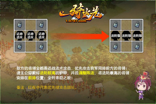 《一骑当先》以打造强力武将为核心战斗力,融合武将技能、九宫格战斗格局和九大阵型的排兵布阵玩法,以三国历史上著名的战役为关卡,逐步推进游戏进程。《一骑当先》的策略性主要表现在九宫格战斗阵法的布置和武将职业技能的对阵相克之上。目前游戏中一共有九种阵法,不同的阵法可以为玩家的战斗带来不同的属性加成。并且阵法中,敌我双方的攻击顺序及攻击目标不仅受到站位的影响,还受到武将的属性和职业的影响。出手顺序,按武将敏捷值的高低判定,速度越快的越先出手;而出手后的攻击对象,则跟出手武将的职业属性及站位有关。